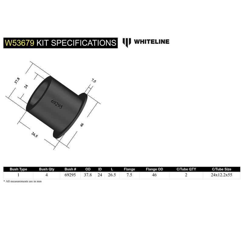 Benefit Note: Worn front control arm bushings have a huge influence on vehicle stability, steering precision and braking efficiency. Replace worn bushings to as new condition utilising Whiteline's advanced synthetic elastomer bushings with core characteristics ensuring superior elasticity, memory and outright durability for all forms of driving applications.