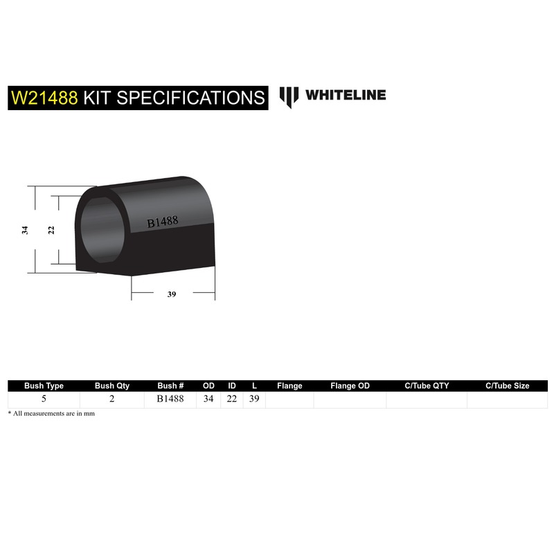 Benefit Note: Designed to fit a 22mm sway bar. Whiteline's sway bar mount bushings not only boasts the latest in bushing material technology but feature a knurled ID specifically designed to retain grease. Backed up by a Limited Lifetime Warranty. Whiteline bushings are made from the latest highest quality synthetic elastomer and designed to synchronize your suspension system for optimal safety, handling, performance, ride quality, longevity and reduced maintenance. They are the most positive link between your vehicles body, springs, struts, arms, bars and shocks.