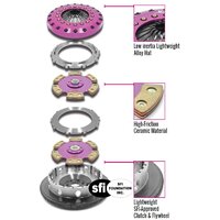 Kit includes: Lightweight alloy cover, 2x rigid ceramic friction discs, performance flywheel, pull to push conversion components